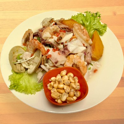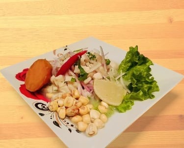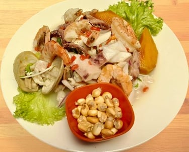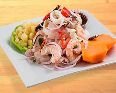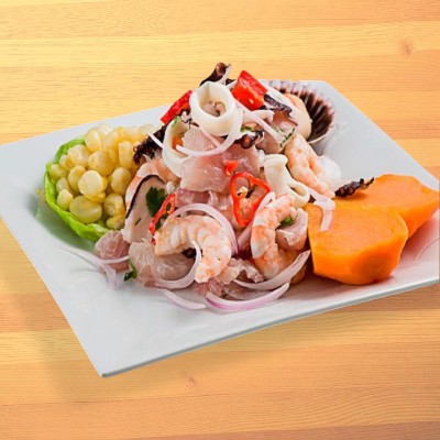 Pescado marinado en limon con cebolla,camote,yuca,camarones,calamar,almeja y tostado